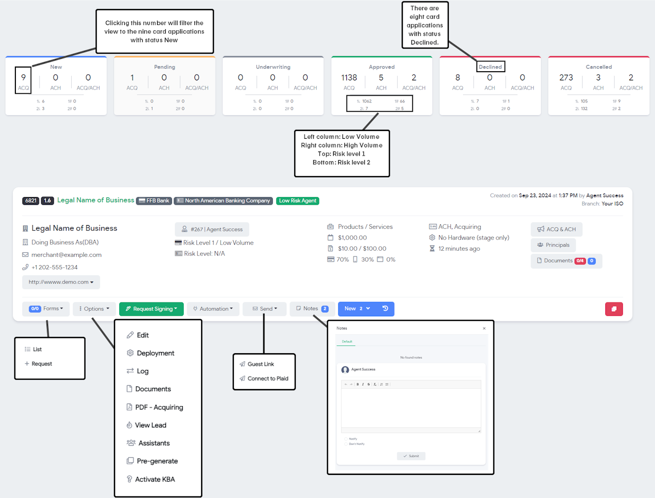 Each status will break up the application based on the processing type: ACH, ACQ (Card), or Both. Additionally, the counter will break down the risk level and volume for Card applications in each status: Risk Level 1 High/Low Volume and Risk Level 2 High/Low Volume.
