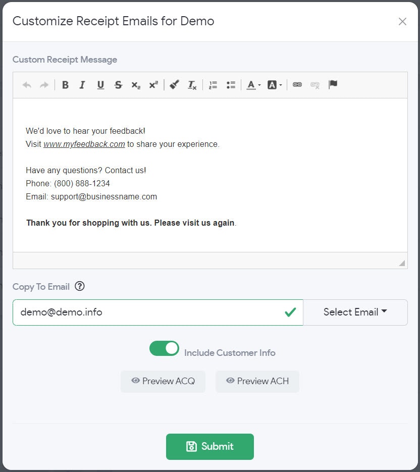 The Customize Receipt function enables businesses to modify the payment receipts emailed to customers after a successful transaction.