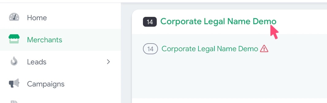 Click on the merchant name to view details specific to a client.