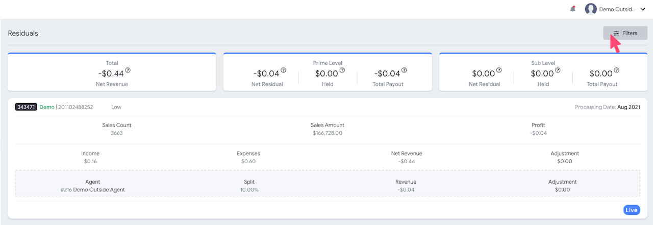 The Residuals page offers insight into earning on the portfolio boarded under this system. The filter on the top right will enable filtering data by Agent, MID, Acquirer, and Month. The filter will also enable publishing residual data to agents that are boarded under you.