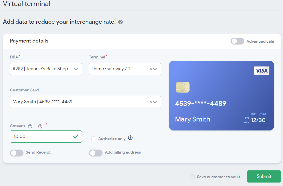 Additionally, the Virtual Terminal supports Level 2 and Level 3 processing to help lower interchange costs.